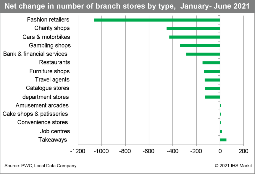 - Research conducted by the Local Data Company on behalf of accountancy firm PwC estimates that close to 9,000 chain stores closed in UK high streets and commercial centers and retail parks in the first six months of 2021, which amounts to an average of nearly 50 physical outlets per day. This was accompanied by 3,488 stores opening in the same period, implying a net decline of 5,251 outlets, 750 fewer net closures than in the first six months of 2020.