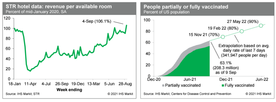 - Revenue per available room at US hotels last week, after seasonal adjustment, was 6% above the January 2020 level (IHS Markit estimate based on weekly data from STR). While encouraging, the jump in seasonally adjusted activity could reflect the timing of the Labor Day holiday. Readings over the next few weeks will clarify the underlying trend in hotel activity. Meanwhile, averaged over the last seven days, about 342,000 people per day received a first (or only) dose of a COVID-19 vaccination, down from the prior week's rate of about 421,000 per day. New vaccination mandates at the federal level have the potential to raise this rate in coming weeks. As of yesterday, 208.3 million US residents, or about 63.1% of the population, were at least partially vaccinated against COVID-19. (IHS Markit Economists Ben Herzon and Joel Prakken)