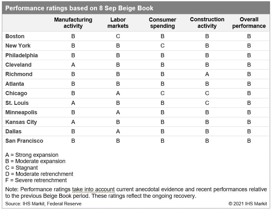 - The surge in Delta-variant cases and hospitalizations and continuing international travel restrictions posed challenges for leisure and hospitality businesses in early July and August, resulting in modestly lower growth in much of the country according to the US Federal Reserve's latest Beige Book report, containing anecdotal information from regional business contacts. While retail sales were supported by healthy back-to-school shopping, auto sales sagged from the microchip shortage and leisure spending eased off in much of the country as the Delta variant surged. Employment continued to rise, but widespread reports of labor shortages restrained business growth. Supply chain disruptions, exacerbated by Delta-variant outbreaks internationally, hampered manufacturing operations along the West and East Coasts. Lack of homebuilding materials and labor limited new construction in the Great Lakes while homebuilders in the South pushed ahead. (IHS Markit Economist James Kelly)