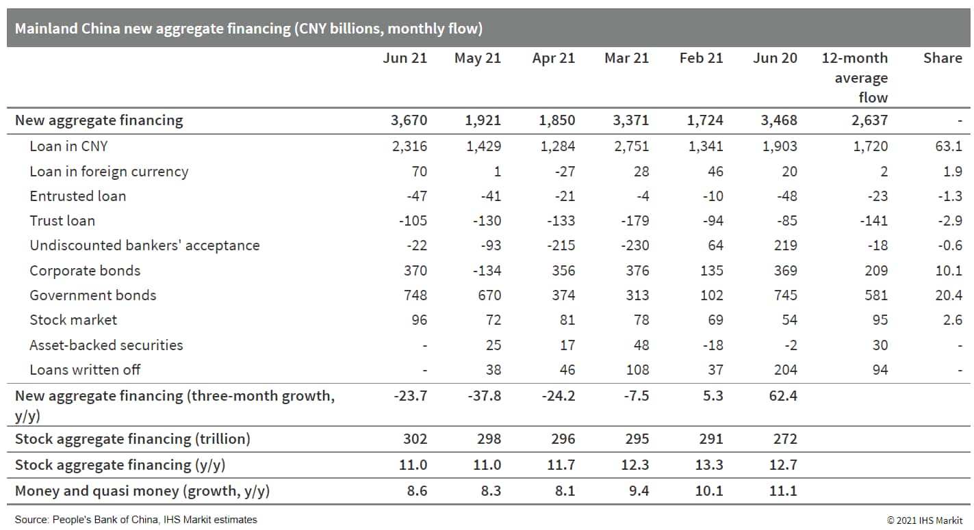 - Mainland China's new TSF—the broadest measure of net new financing to the real economy - totaled CNY3.67 trillion (USD571.4 billion) in June, up by CNY201.9 billion year on year (y/y) according to the People's Bank of China (PBoC). Stock TSF reached CNY301.56 trillion by June end, up by 11.0% y/y - stabilizing after three consecutive months of stock TSF growth rate decline. (IHS Markit Economist Lei Yi)