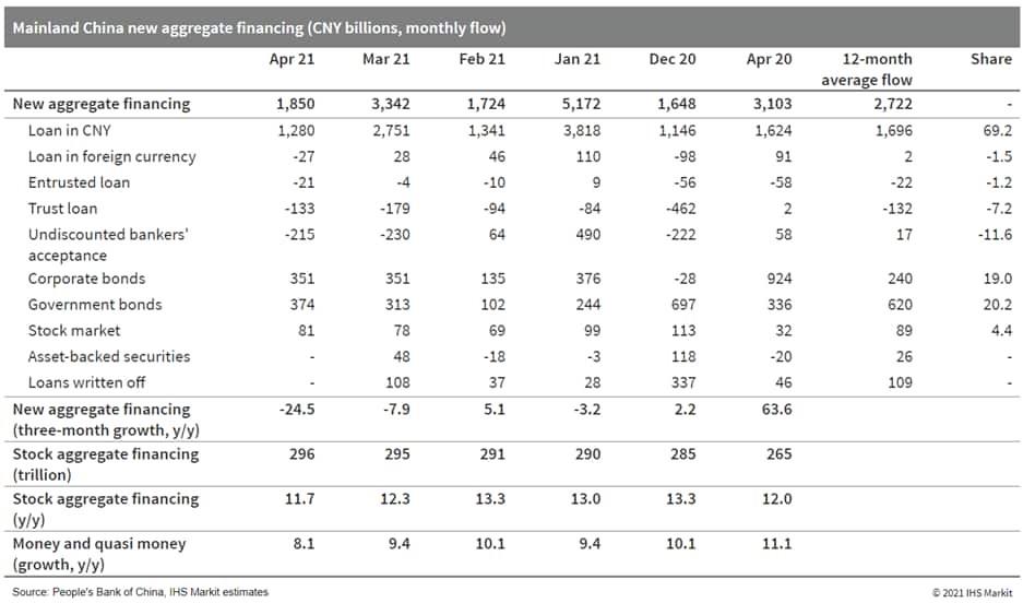- Mainland China's new total social financing (TSF), the broadest measure of net new financing to the real economy, reached CNY1.85 trillion (USD281.90 billion) in April, according to the People's Bank of China (PBOC). Despite a smaller high-base effect than March, the April TSF release marks a decline of CNY1.25 trillion year on year (y/y), although still higher than 2019 comparable level by CNY179.7 billion. Stock TSF amounted to CNY296.16 trillion, up by 11.7% y/y and down by 0.6 percentage point from the month-ago growth rate. (IHS Markit Economist Lei Yi)