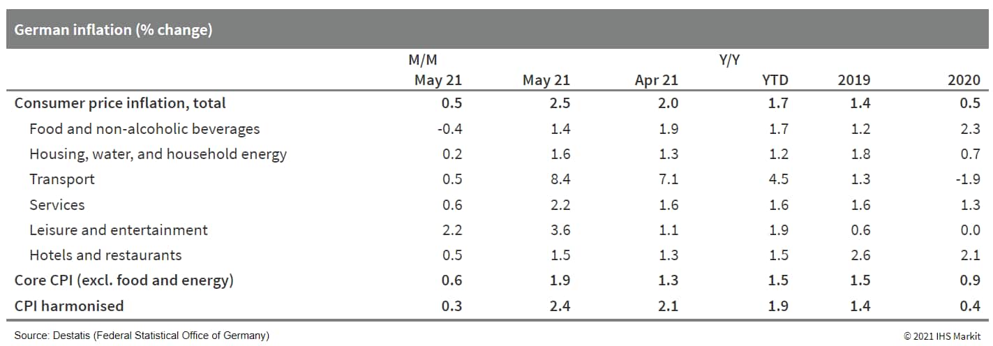 - Unlike in April, Germany's core inflation joined the headline measure's further sharp increase in May. Higher energy prices contributed anew, but the key factor at the data edge was the spike in the prices of recreational and cultural activities as related firms began to return to business with the gradual loosening of COVID-19 virus restrictions. (IHS Markit Economist Timo Klein)