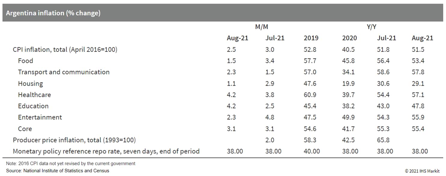 - Argentina's consumer price index (CPI) increased by 2.5% month on month (m/m) during August. The increase in consumer prices was most pronounced in the healthcare, education, and the clothing and apparel sectors. (IHS Markit Economist Paula Diosquez-Rice)