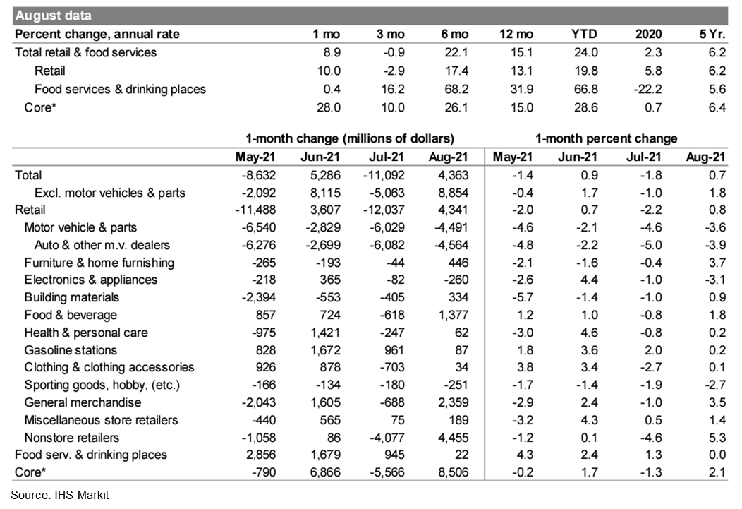 - Total US retail trade and food services sales increased 0.7% in August. Excluding autos and gasoline stations, retail sales rose 2.0%. (IHS Markit James Bohnaker and William Magee)