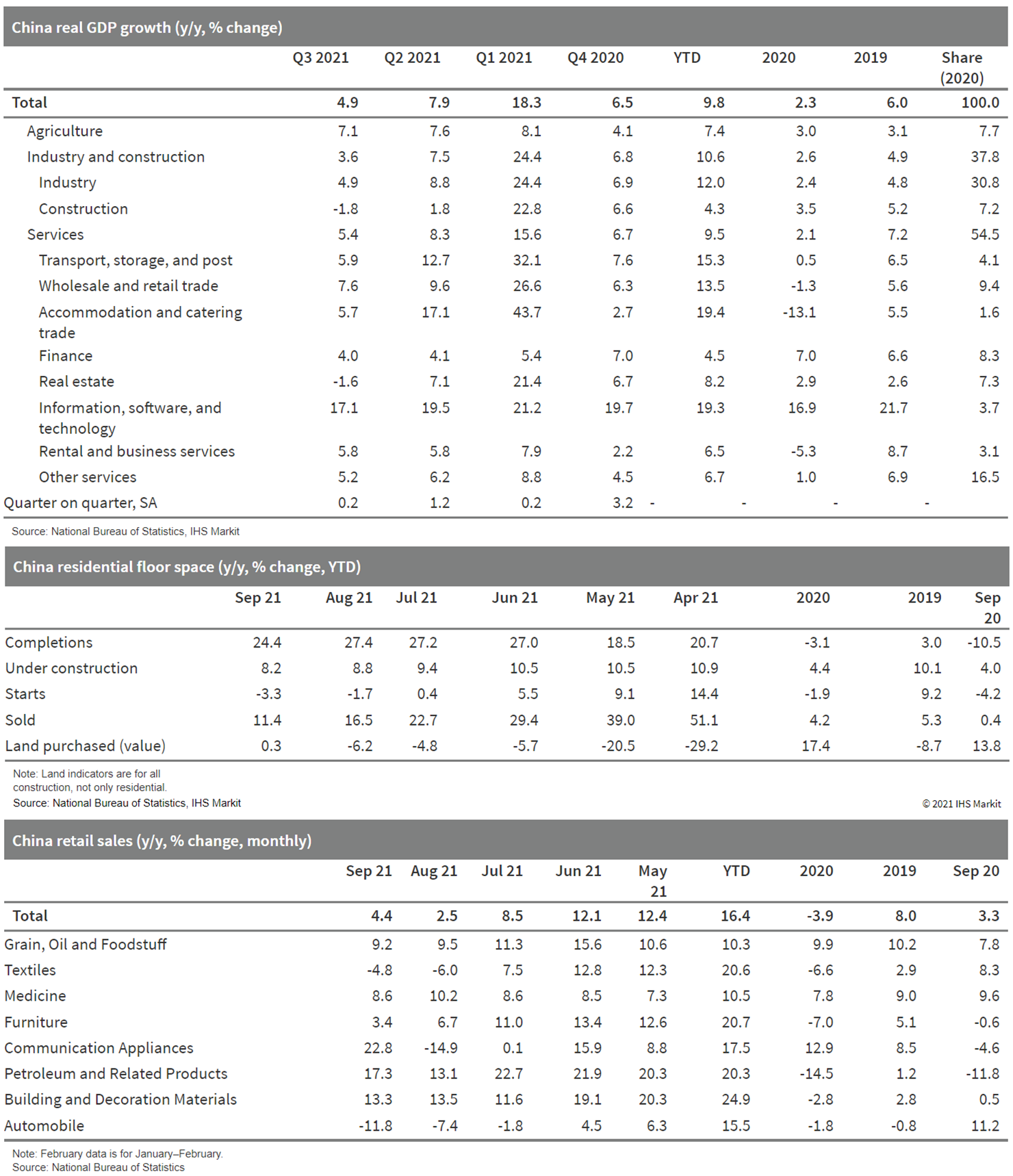 - China's economic expansion lost momentum in the third quarter as the power crunch and soaring commodity prices curbed industrial production, tightening property market regulations and slow local government bond issuance dragged on fixed-asset investment (FAI), and escalating pandemic controls took a toll on retail sales. Further slowdown is expected in the fourth quarter. (IHS Markit Economist Yating Xu)