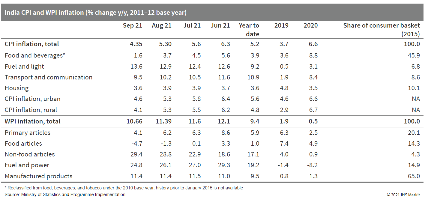 - Moderating food prices and high base effects pushed India's headline consumer price index (CPI) and wholesale price index (WPI) inflation to five-month lows of 4.4% year on year (y/y) and 10.7% y/y respectively in September, while the Reserve Bank of India (RBI) maintained its accommodative policy stance in October. (IHS Markit Economist Hanna Luchnikava-Schorsch)