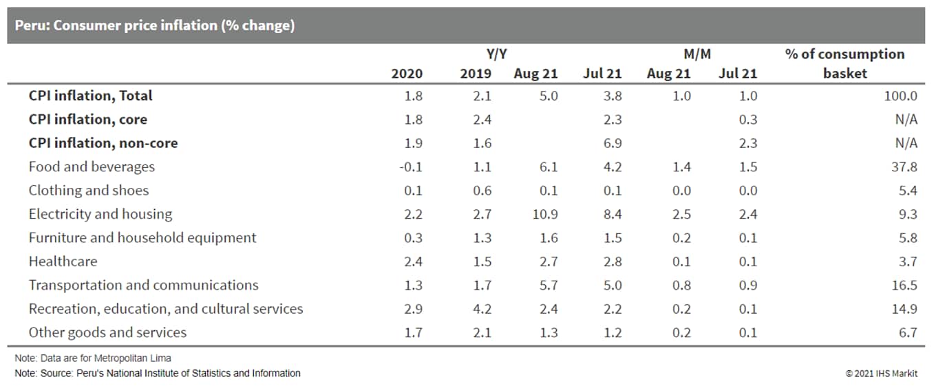 - Consumer prices in Peru rose by 5.0% year on year (y/y) in August, the fastest pace since February 2009. (IHS Markit Economist Jeremy Smith)