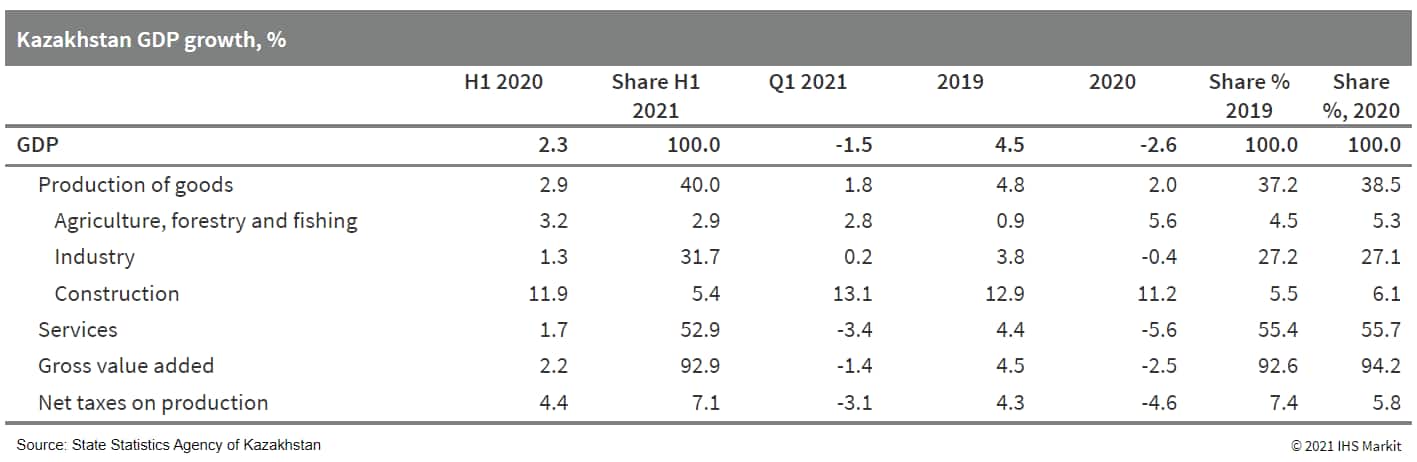 - Kazakhstan's real GDP growth returned to positive territory in the second quarter of 2021, and the economy in the first half of the year expanded by 2.3% in annual comparison. The slowly improving epidemiological conditions and some progress in the immunization program, combined with the positive OPEC+ output talk results and reasonably bright export outlook, keep the near-term growth projections fairly positive, although the pandemic still marks significant risks. (IHS Markit Economist Venla Sipilä)