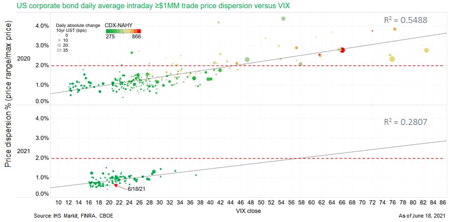 - As shared during today's IHS Markit's webinar 'Dynamic Tolerance Data - Improving the Efficiency of the Daily Pricing Process', the below graph shows the 2020/2021 average price dispersion of ≥$1MM US corporate bond trade prices versus the VIX equity volatility index, with the color scale representing CDX-NAHY spreads and the size of the markers indicating the absolute daily change in 10yr UST yields. The data indicates that the average price dispersion was >2% every time the VIX closed above 46 in 2020, with the subdued VIX levels in 2021 translating into lower price dispersion in the US corporate bond market. (IHS Markit Fixed Income Research's Chris Fenske)
