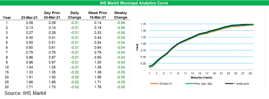 - IHS Markit's AAA Tax-Exempt Municipal Analytics Curve (MAC) yields improved by 1-2bps across the curve today, with maturities three-years and shorter 6bps better week-over-week.