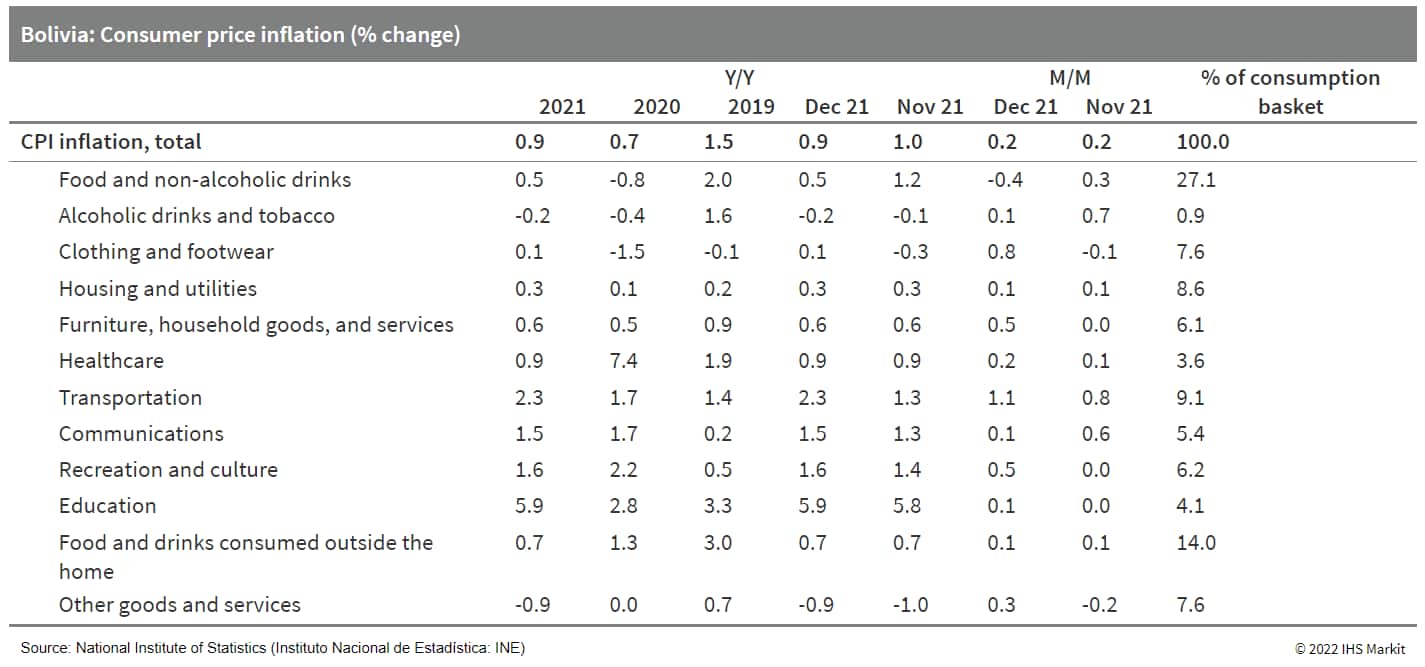 • President Luis Arce announced on 22 January that the country had recorded 6% real GDP growth for full-year 2021, which, if confirmed by the INE, would be consistent with IHS Markit estimates for the fourth quarter.