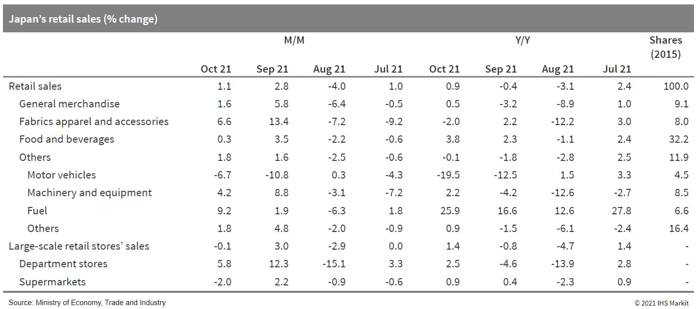 - Japan's retail sales increased by 1.1% month on month (m/m) in October following a 2.8% m/m rise in September. The year-on-year (y/y) figure also rose by 0.9% after two consecutive months of declines. The continued m/m improvement largely reflected the gradual easing of COVID-19 containment measures and a faster rise in fuel prices. (IHS Markit Economist Harumi Taguchi)