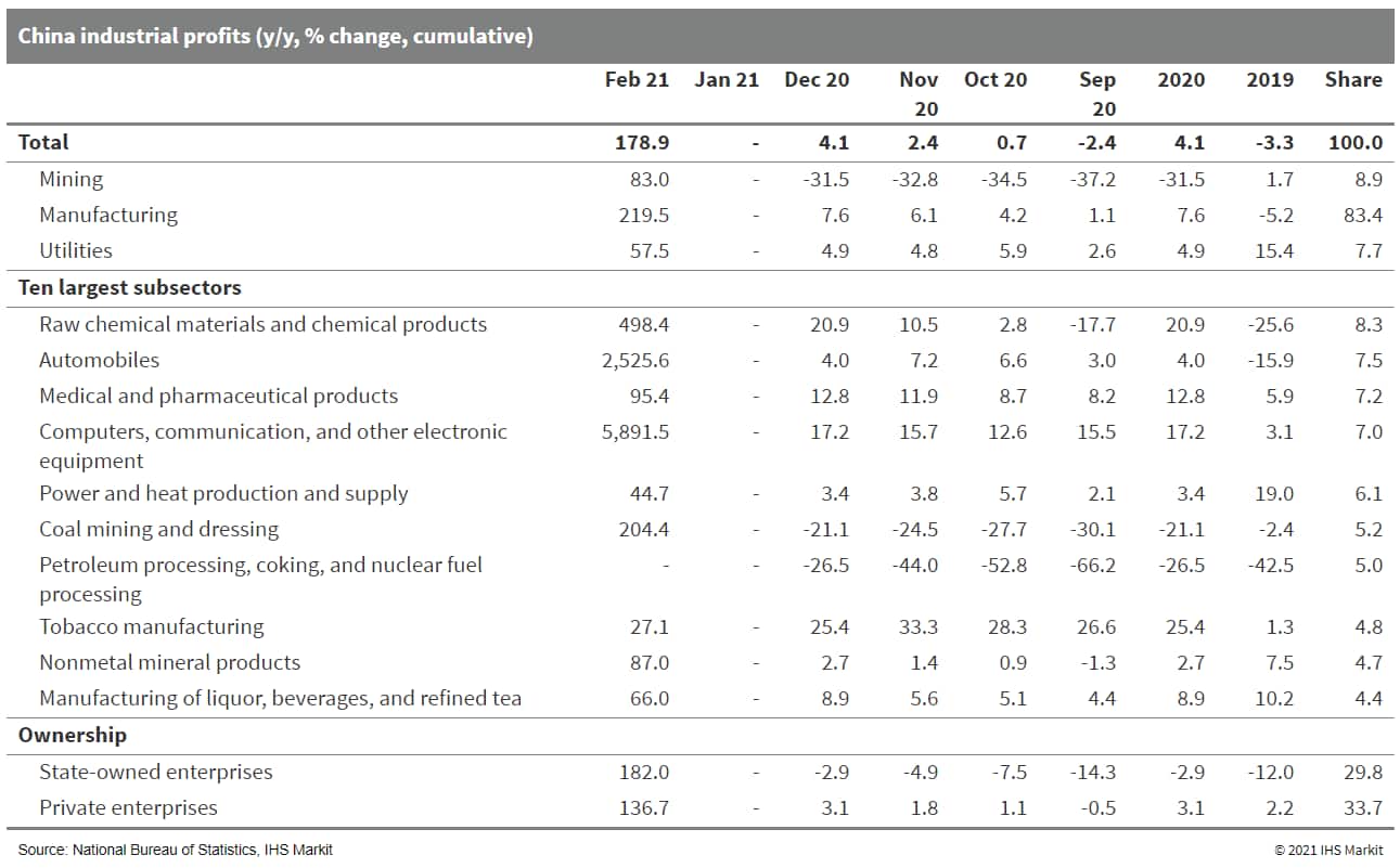 - Mainland China's industrial profits grew 179% year on year (y/y) cumulatively in the first two months of 2021, largely owing to the COVID-19 pandemic-induced low base in 2020. Compared with January-February 2019, industrial profits expanded by 72.1%, or by an average growth rate of 31.2% y/y over 2020-21, according to the National Bureau of Statistics. (IHS Markit Economist Lei Yi)