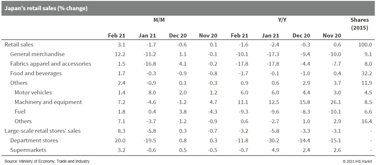 - Japan's retail sales rose by 3.1% month on month (m/m) in February following two consecutive months of declines, although year-on-year (y/y) growth remained sluggish, recording a 1.6% drop. (IHS Markit Economist Harumi Taguchi)