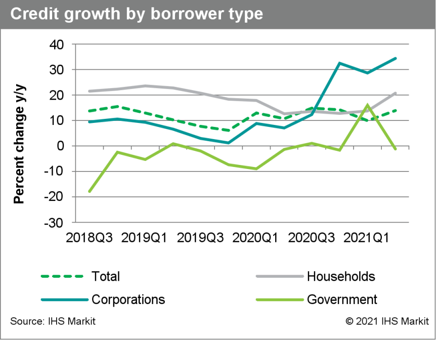 - According to the latest data from the Central Bank of Russian Federation (CBR), credit growth accelerated to 14% year on year (y/y) in the second quarter of 2021, up from 9.9% y/y in the first quarter. Household credit rose by 20.7% y/y, driven by a surge in mortgages and unsecured loans, while corporate credit increased by 34.4% y/y. (IHS Markit Banking Risk's Greta Butaviciute)
