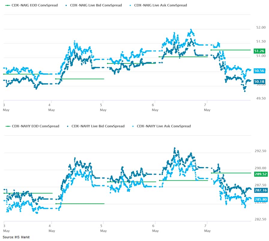 - CDX-NAIG closed -1bp/50bps and CDX-NAHY closed -3bps/286bps, which is flat for both indices week-over-week.