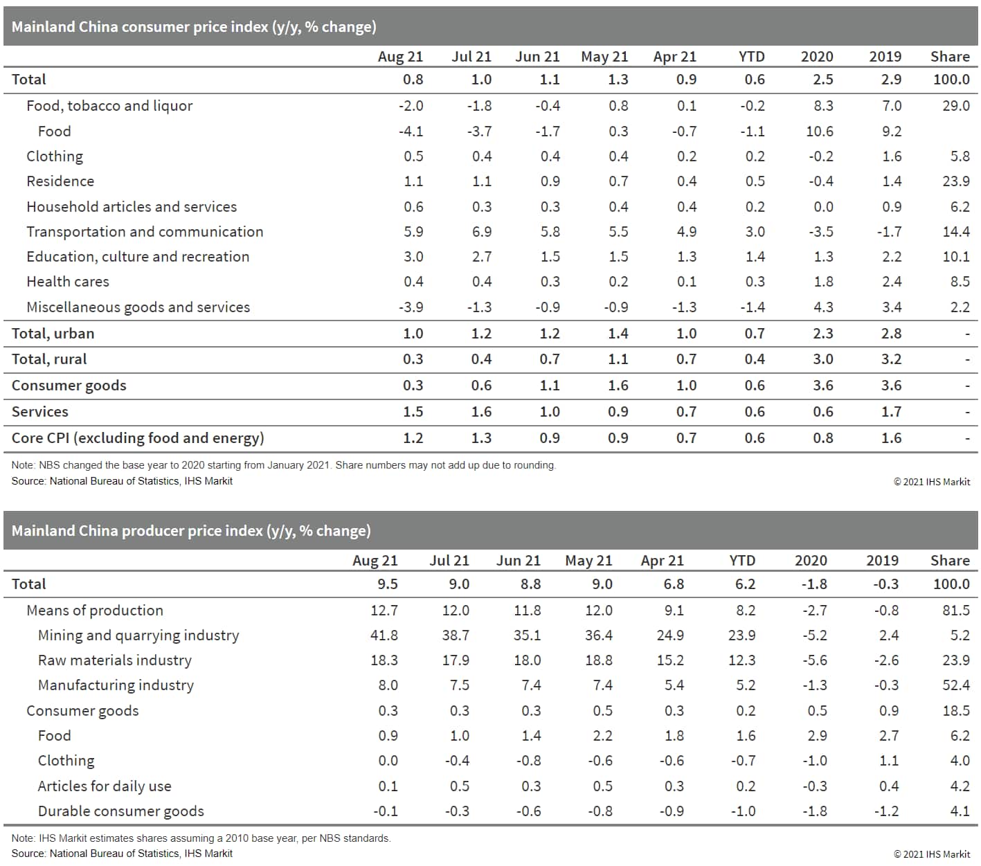 - Mainland China's Consumer Price Index (CPI) increased by 0.8% year on year (y/y) in August, down by 0.2 percentage point from the July reading, according to the National Bureau of Statistics (NBS). Month-on-month (m/m) CPI inflation edged down by 0.2 percentage point to 0.1% m/m, staying in the inflation territory despite renewed regional outbreaks in August. (IHS Markit Economist Lei Yi)