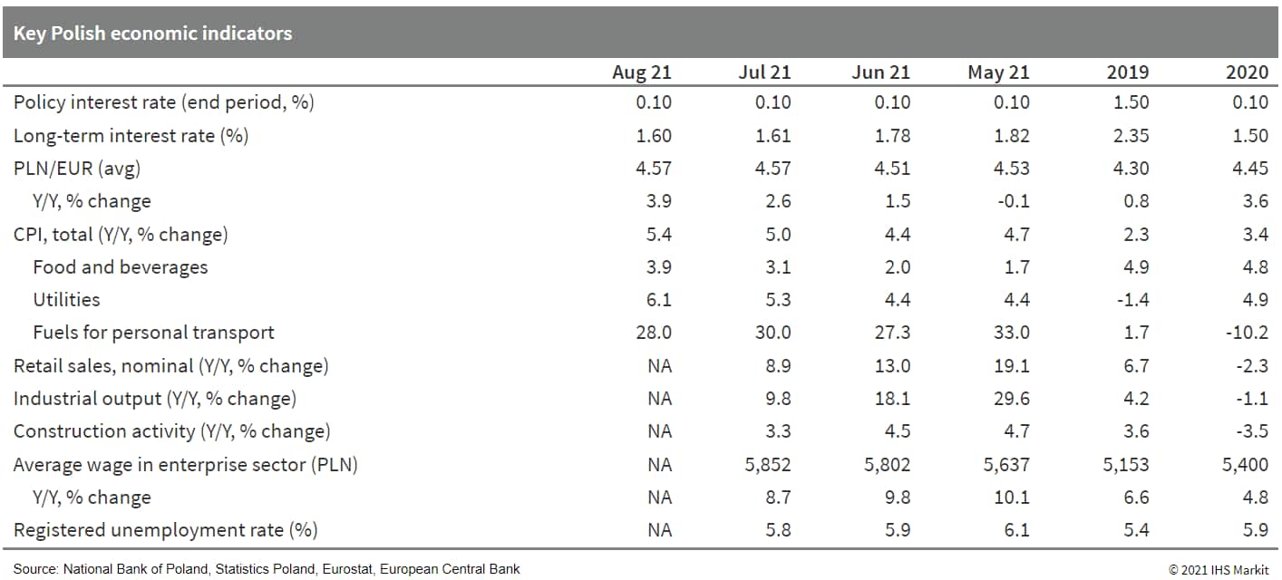 - Poland's monetary policy council (MPC) left the base interest rate at a historic low of 0.1% during its session on 8 September. That was despite monetary tightening across much of Central and Eastern Europe in recent months. (IHS Markit Economist Sharon Fisher)