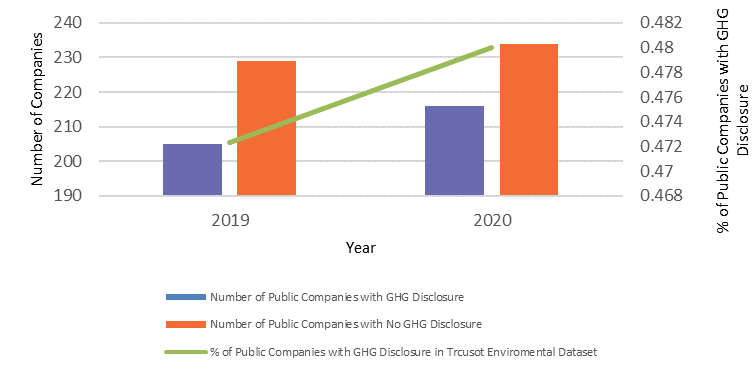 The disclosure status shows that a company recognizes its major emission sources and emission conditions, which can help set goals for improvement. In the past two years, an increasing number of energy and utility companies in APAC have reported their GHG emissions, as shown in Figure 3. The improvement of environmental disclosure applies to almost all industries and is likely in response to growing pressure from regulators and investors for more transparency.