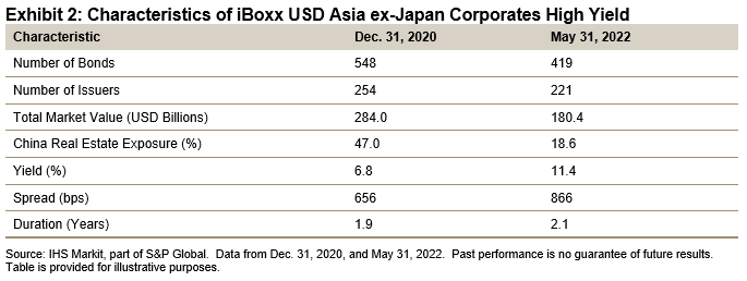 Once dominating the Asian USD high yield credit bond market, the Chinese property sector has shrunk significantly after the spate of defaults and sell-offs. On Dec. 31, 2020, China's real estate issuance accounted for 47.0% of the iBoxx USD Asia ex-Japan Corporates High Yield. By the end of May 2022, its share had dwindled to 18.6%. As expected, the index characteristics between the two dates are also significantly different, as illustrated in Exhibit 2.
