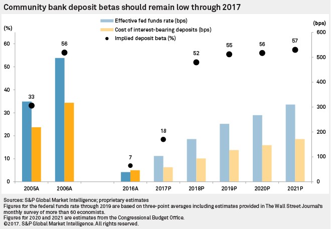 Betas, or the percentage of changes in market rates institutions pass on to their customers, at community banks were only 7% in 2016 and rose to 10% through the first six months of 2017, compared to 12% and 13.5% across the whole U.S. banking industry. Community banks trailed their larger counterparts during the last tightening cycle as well.