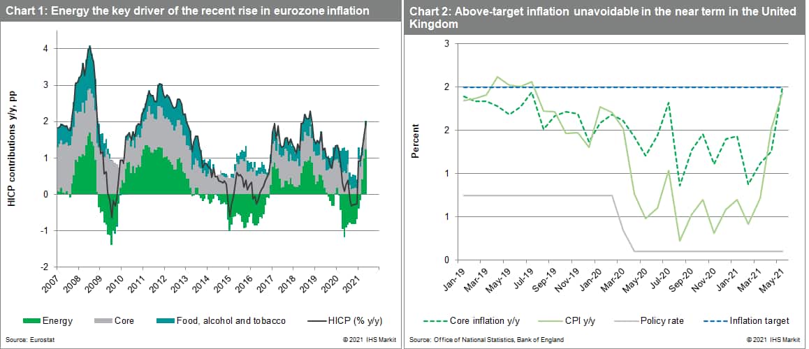 Recent rises in Western European inflation have largely been driven by energy prices (Chart 1), while output gaps remain large and demand-side inflation pressures modest. IHS Markit does not expect policy rate rises in the eurozone until 2025.
