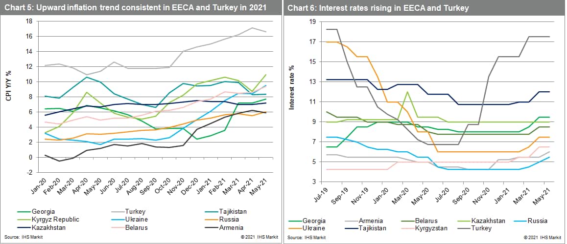 The EECA countries have experienced the most pronounced monetary policy shift globally since the start of the year. Thus far, the region's net energy importers have been tightening their policy, with Russia, as a net energy exporter, being the only exception. Severe inflationary risks, both transient and more persistent, have forced Armenia, Belarus, Georgia, Kyrgyzstan, Russia, Tajikistan, and Ukraine to raise their policy rates, in some cases multiple times already (Charts 5, 6). Inflation is accelerating owing to rebounding market prices for energy and food, as well as exchange-rate volatility. Moreover, domestic demand has started to recover, pushing up core inflation. We expect further monetary tightening by most EECA central banks, including those of Kazakhstan and Moldova, through 2021 and early 2022.