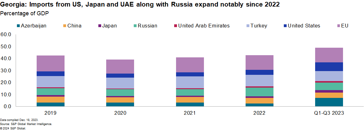Georgia's real GDP has been posting robust growth since the start of the war, up by 10.1% in 2022 and estimated to have expanded by 7.8% in 2023. The economic boost has come by way of inflow of capital, skilled labor, and increased trade both in goods and services. Georgia is not part of the Russia-led Customs Union, but its geographic proximity to Russia has given the country a notable role in the rerouted trade, including for goods movement from Armenia and Turkey to Russia.