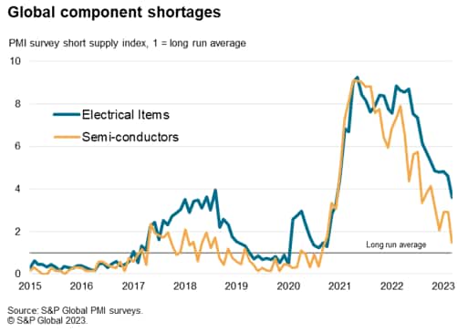 Average supplier delivery times for inputs to electronics firms improved worldwide in March for the first time since June 2019, with lead times shortening to an extent not seen since the bursting of the dot-com bubble in 2001.