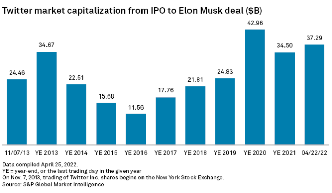 The microblogging company already faced questions about its content moderation practices and slowing user growth. After spiking to 33.8% early in the pandemic, Twitter's monetizable user growth had slowed to 13% in its most recent reporting period. The company also faced heightened political uncertainty amid questions about how it balanced free speech with concerns about misinformation or hate speech on its platform. Twitter reports monetized daily active users or usage, which only counts subscribers who are using its ad-support or subscription applications. The company is scheduled to report first-quarter 2022 financials on April 28.