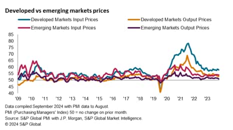 With the US Federal Reserve expected to lower interest rates imminently in September, the focus is also on further potential moves in the emerging market space. Turning to PMI price indicators for clues on inflation, the latest August data showed that price pressures have softened in the latest survey period.