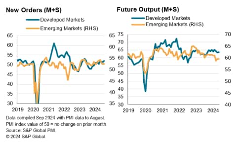 Emerging market economic growth slowed midway through the third quarter of 2024, according to S&P Global's PMI surveys, but remained relatively more broad-based compared with developed markets as both manufacturing and service sector continued to expand. The slowdown in manufacturing output expansion is nevertheless worth monitoring, particularly with trade conditions having worsened for the first time in 2024.