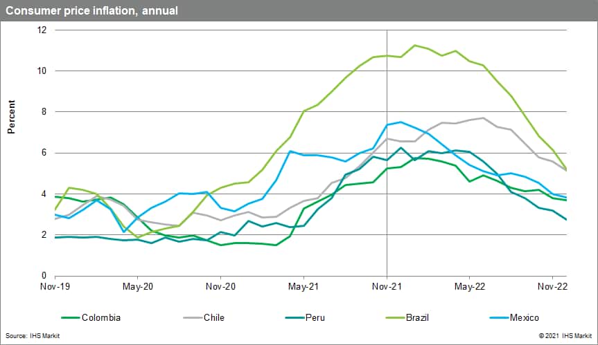 Worryingly, inflation in services is also increasing, implying there have been second-round effects or contagion from commodity-driven inflation. IHS Markit expects oil prices to decline in 2022, reducing external inflationary pressures, but supply chain relief is unlikely before late in the year. Semiconductor import shortages will hurt carmakers in Mexico, Brazil, and Argentina, and Latin American exporters of perishable agriculture goods face shortages and high prices of fertilizers into early 2023. Strikes by truck drivers' associations in Argentina, Brazil, Chile, and Peru are an additional risk.