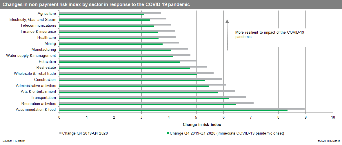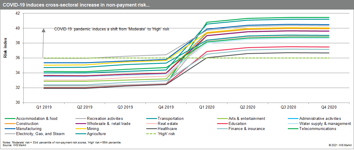 The COVID-19 pandemic has evidently had a profound effect on non-payment risk across all countries and sectors, with nearly all sectors shifting up from the 'Moderate' risk band to the 'High' risk band according to our estimates.