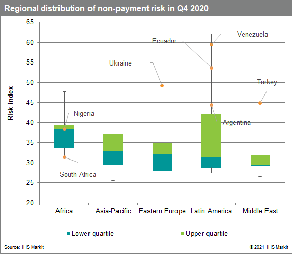 COVID-19 is not the only factor driving non-payment risks. The variation in risk across regions reflects the country and sector-specific factors that pre-date the pandemic's onset. By far the greatest variation in risk is found in Latin America. Despite a comparatively lower regional average, there are several notable outliers, such as Venezuela, Ecuador, and Argentina, with the region being the worst affected by sovereign rating downgrades in Q4 2020: a total of 13 sovereigns. Conversely, we estimate that sectors in Africa will experience the highest risk of non-payment of average, yet countries are more tightly clustered around this average and trend towards the lower quartile.