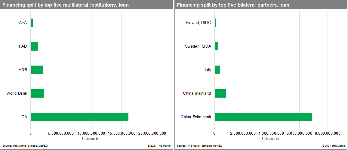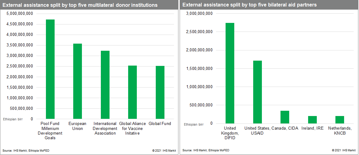 Achieving envisaged multilateral support as outlined in the latest budget is expected to depend on IMF program observance. IHS Markit has previously raised concerns that the additional suspension of foreign budgetary support, and/or the IMF and the World Bank withholding funding over the situation in Tigray, could be likely if tensions escalate in the region and this would support a sovereign debt downgrade from our side. However, the Ethiopian government announced on 28 June a ceasefire in the Tigray region, which credibly de-escalates the conflict. If the conflict re-escalates after the rainy season ends in September, when large offensives are more possible, the likelihood of economic sanctions will rise sharply according to our Country Risk experts.