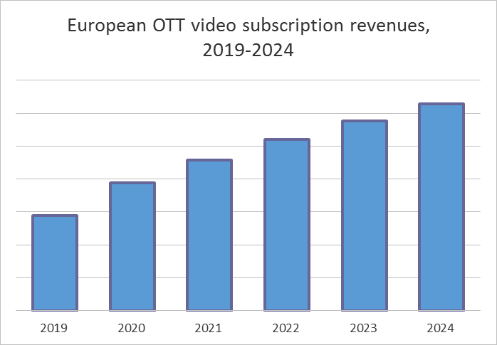 The subscription over-the-top market in Europe should continue growing over the next five years, reaching $14.5 billion in 2024