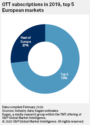 In its 2019 annual results, Netflix reported 51.8 million paid subscribers in the Europe, Middle East and Africa region. Kagan estimates approximately 85% of those subscribers come from the 18 markets in our coverage. Having spent $14.61 billion on programming globally, Netflix has secured the top place in most of our covered European markets other than Germany, Poland and Russia. In Germany, Amazon.com Inc.'s Prime Video is still ahead of Netflix after becoming part of Prime back in 2014. In central and Eastern Europe, incumbents have been able to compete with Netflix and Amazon by pricing their offerings competitively and investing in local programming.