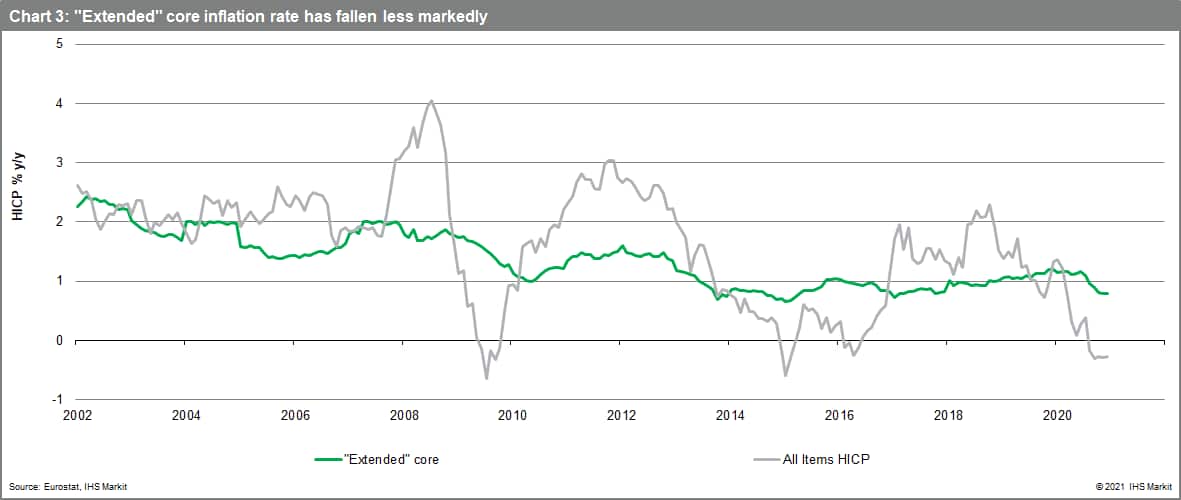 Consider the starting point for HICP inflation rates too. December 2020's final HICP figures confirmed the headline inflation rate below zero for the fifth straight month (-0.3%) and the traditional core rate at record lows, only marginally above zero (0.2%). IHS Markit's "super core" measure of inflation dropped back to its record low also (0.9%). It includes only the HICP items sensitive to the eurozone output gap, so ought to be more reflective of domestic economic trends than global influences.