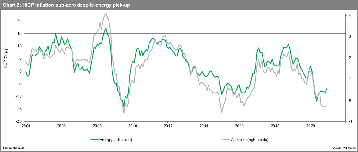 December's HICP data delivered a surprise in a negative direction in fact, with the headline inflation rate unchanged at -0.3% for the fourth month in a row despite upward pressure from energy, as prior oil price gains feed through.