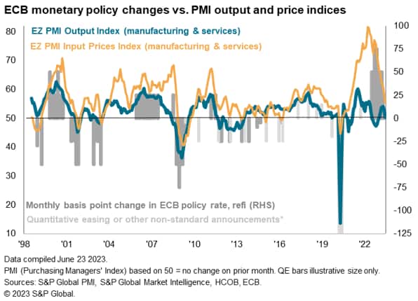June's flash PMI data come on the heels of the European Central Bank (ECB) hiking interest rates again at its June meeting. The deposit facility rate (DFR) has now risen to 3.5%, its highest since 2001, and the refinancing (refi) rate is up to 4%, its highest since 2008. This implies cumulative increases in both of 400 basis points in just 11 months.