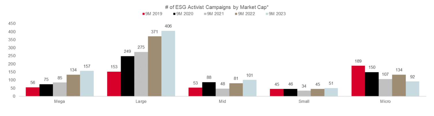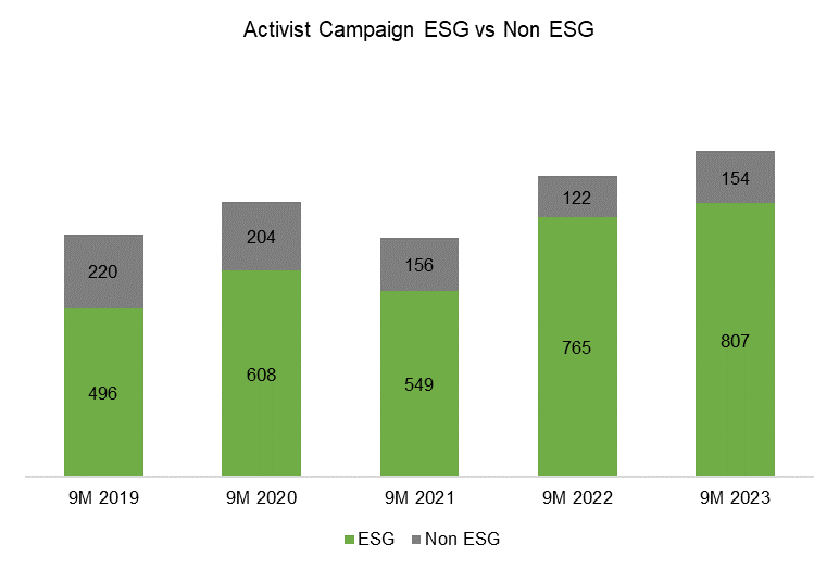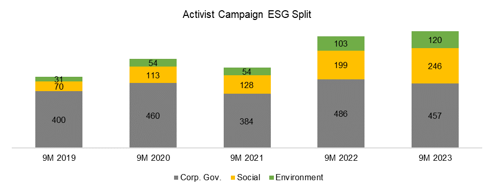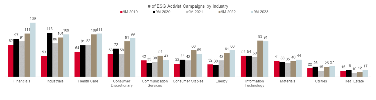 Of all 2023 activist campaigns, 84% are related to ESG. To be fair, governance was typically a component of these initiatives, but that number marks a huge year-over-year increase. What's also interesting is the slowdown in the number of M&A-related campaigns, which might be tightly correlated to the decline in deal-making activity this year.