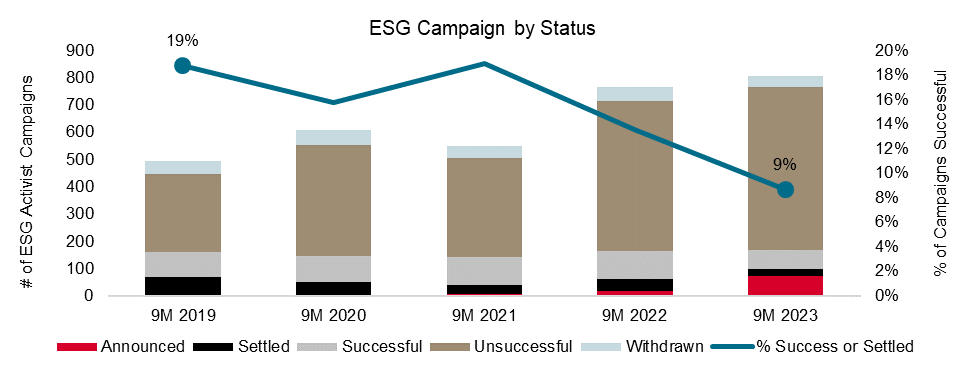 A lot of milestone campaigns took place in 2020, namely ExxonMobil and the Engine No. 1 campaign where they pushed Board member seats to drive cleaner energy. What's interesting is that, gradually, the number of successful campaigns has declined since then. About 20% of campaigns launched in 2019 were successful, but campaigns in 2023 year-to-date are only succeeding at a 9% clip.