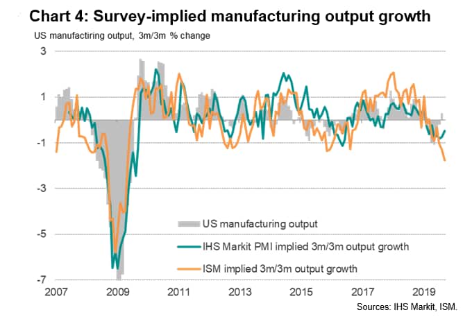 Implied growth rates for manufacturing output, derived from the regressions and shown in chart 4, confirm the extent to which exaggerated growth signals were sent from the ISM surveys over 2017 and 2018. More recently, in 2019 both surveys have signalled falling manufacturing output trends. Note that, although running higher than the ISM data in September, the IHS Markit data are still indicating falling manufacturing output on a three-month-rolling basis, and the 'flash' IHS Markit PMI's output index even fell to its lowest since 2009 back in July, though the rate of contraction has eased slightly. Both surveys are therefore consistent in indicating that the manufacturing recession was most likely extended into the third quarter, but the September divergence remains a concern.