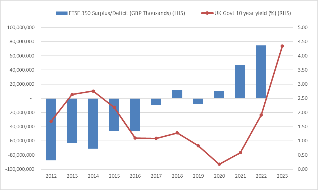 Chart 3: FTSE 350 estimated aggregated pension surplus/deficit and UK Govt 10-year yields
