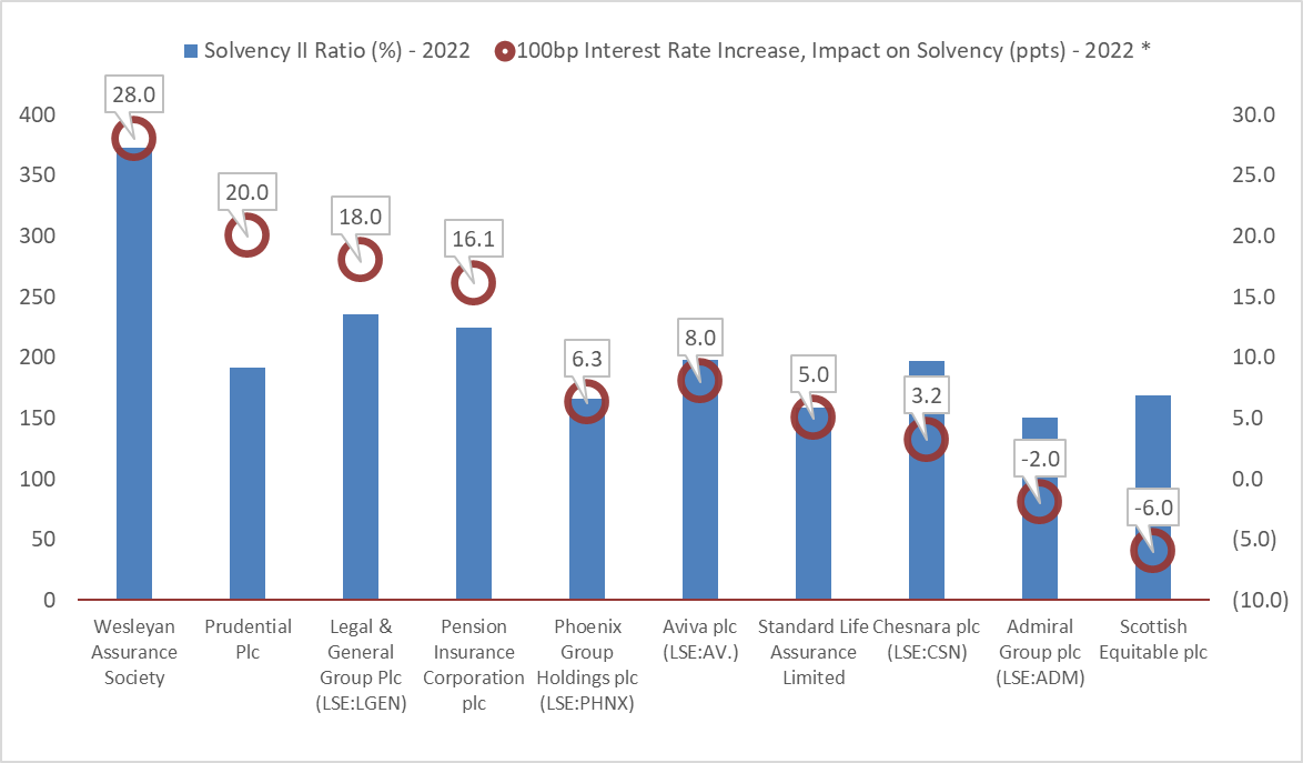 The effects are similar for corporate pension schemes themselves, and we are starting to see the impact of higher rates on the schemes. Typically – and despite the use of LDI techniques - the duration of the liabilities is higher than the duration of the fixed income assets (partially) backing them, and hence the impact of higher rates improves the overall Net Asset Value (NAV) of the schemes. In turn, this improves the prospects of companies to transfer their schemes to properly capitalised and regulated insurance companies. After all, it makes sense for company management to be focusing on their core strengths – for example retail, chemicals, or aerospace – and not on the investment and actuarial challenges of managing a large pension fund. From Chart 2, we can note that many of the large UK Life insurance players – eg Aviva, L&G – are well capitalised to take on new schemes.