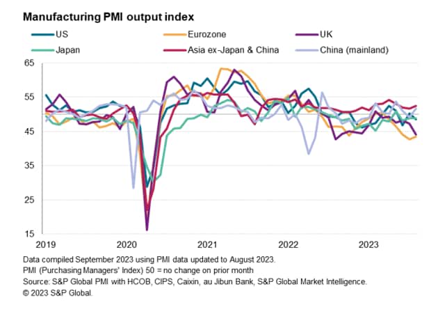 The August surveys point to an ongoing malaise of manufacturing, with production levels continuing to edge lower amid a further deterioration in demand, in turn leading to a depletion of work-in-hand. Global trade in particular is showing further signs of deteriorating, but it is notable that production and order book trends are weakest in Europe and the US amid rising interest rates and elevated inflation.