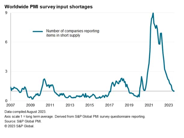 One factor providing a support to production, facilitating the fulfilment of back orders, was a further improvement in supply conditions. Average supplier delivery times shortened globally for a seventh successive month in August. This represents the longest continual period of supply-chain improvement recorded by the survey since the global financial crisis, albeit coming on the heels of the biggest supply chain disruption on record thanks to the pandemic.