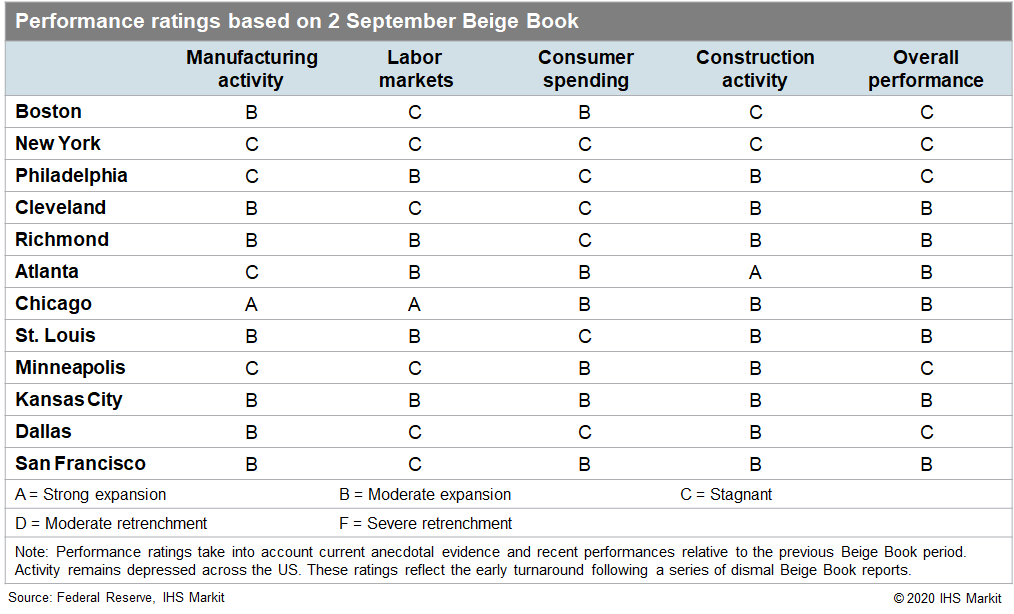 Economic activity continued to increase in much of the country in July and August according to the US Federal Reserve's latest Beige Book report, containing anecdotal information from regional business contacts, but increasing COVID-19 outbreaks and heightened uncertainty around the course of the pandemic put the brakes on the recovery in Texas and resulted in stagnation in the Northeast. Hiring lost momentum over the summer as COVID-19 cases rose in the South and concerns around infection risk, childcare, and the coming school year limited employment growth in many regions. Retail sales dipped sharply in Texas as the pandemic ballooned while the ongoing travel recession limited consumer spending gains in tourism-heavy metros in California, the Northeast, and the South. The continued restart of automotive manufacturing plants boosted steel production in the Midwest, but weak activity in the Northeast and declining new orders elsewhere point to a slower end of the year. Homebuilding activity was modest outside the Northeast and was brisk in the West, but strong homebuyer demand overwhelmed the market in the South as low mortgage interest rates coaxed buyers into the market.