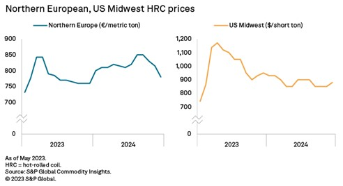 The positive sentiment that helped northern European hot-rolled coil (HRC) prices rise 25% over the first quarter of this year has evaporated. The northern European HRC price lost €50 per metric ton over the first half of May, averaging €802 per metric ton (t) ex-Ruhr, compared with an average of €843/t in April. The price decline is compounded by buyers holding off purchases and mills not offering in an uncertain market environment.